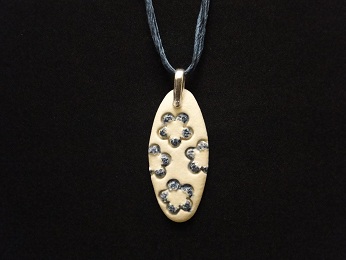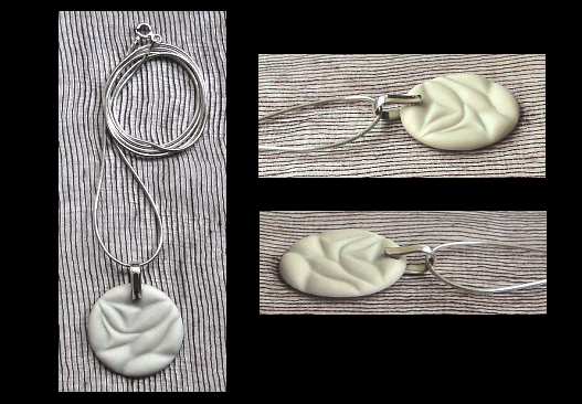 Porcelana branca trabalhada em relevos. Devido ao estilo e cor da peça definiu-se como mais adequado o uso de um cordão de prata, tipo rabo de rato.