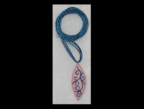 Porcelana rosa com desenho em baixo relevo pintado com porcelana azul. Cordão com fios de seda azul na mesma cor do desenho.