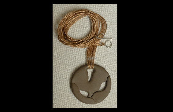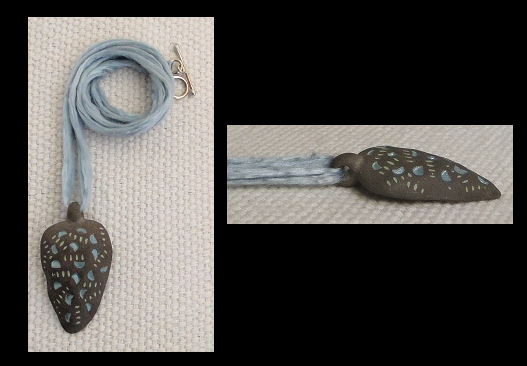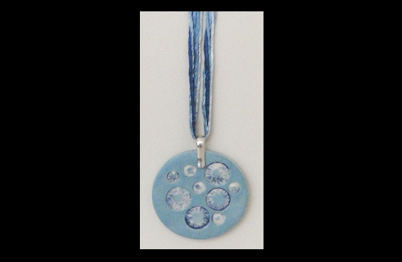 Cerâmica pintada de azul com círculos em relevo e pintados com azul escuro. Cordão com fios de seda em vários tons de azul.