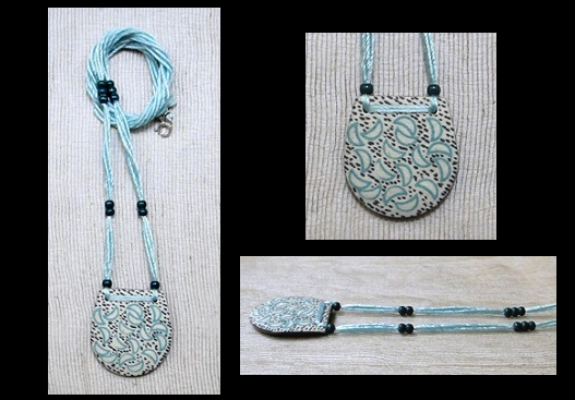 Cerâmica branca decorada com desenhos em verde água escuro e pingos em preto. Cordão de seda tingido do mesmo tom verde com contas de porcelana.