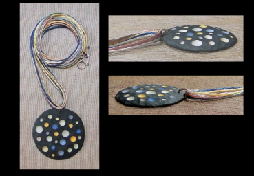 Porcelana preta com círculos em baixo relevo pintado com porcelana colorida. Cordão com vários fios tingidos para combinar com a pintura dos círculos.