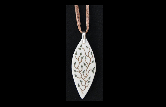 Cerâmica branca com folhagem verde escuro. Cordão com fios de seda marrom como os caules das folhas.