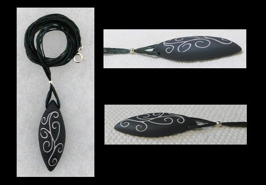 Porcelana preta e desenho em porcelana rosa. Cordão com fios de seda tingidos de preto e uma bolinha de prata