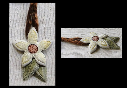 Cerâmica branca pintada com miolo e pétalas esmaltadas e folhas opacas. Cordão de seda rústica tingida de marrom.